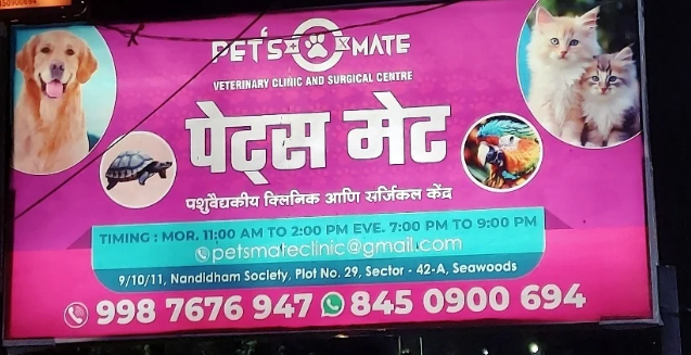 PETSMATE is a trusted multi-service veterinary clinic and pet care centre located at Nandidham CHS, Sector 42A, Seawoods, Navi Mumbai. Led by Dr. Kiran R. Bendale, a highly experienced veterinarian known for his immense expertise, compassion, and prompt responsiveness to pet owners, the clinic is one of Seawoods' most popular destinations for complete pet care. Dr. Kiran is widely praised for answering phone calls personally, providing right guidance, and never being rude. The clinic also has Dr. Chetan on the team. PETSMATE offers veterinary consultation, surgery, pathology, vaccinations, deworming, dental scaling, professional pet grooming, boarding, pet food, and accessories — all under one roof. Known for the longest working hours in the area for maximum convenience to pet owners, PETSMATE is a one-stop shop for all pet care needs in Seawoods and surrounding Navi Mumbai.
