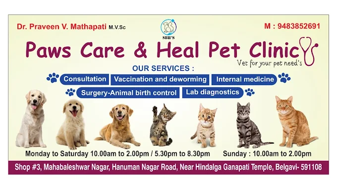 Paws Care and Heal is a veterinary clinic in Hanuman Nagar, Belagavi offering general veterinary consultation, vaccination & diagnostics, surgery, dermatology services. Dr. praveen is a veterinary doctor in Belagavi with 11 years of experience. Looking for a pet clinic in Hanuman Nagar, Belagavi? Book an appointment online with Dr. praveen at Paws Care and Heal.
