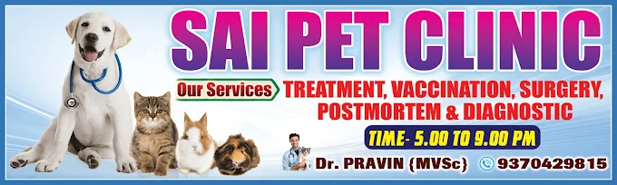SAI PET CLINIC - Animal hospital in Chandrapur. Rated 4.8 stars (5 reviews). Services: Puppy Consultation, Treatment, Vaccination, Deworming, Minor and Major Surgeries, Routine Health Check-up and more. Professional veterinary care with comprehensive services. Open daily, closes 9 PM.