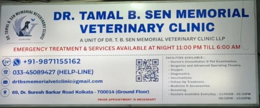 Dr. T. B. Sen Memorial Veterinary Clinic is a veterinary clinic in Entally, Kolkata offering superphone x100, general medical consultation, emergency & critical care (24/7), veterinary radiology (x-ray) services. Dr. T. B. Sen is a veterinary doctor in Kolkata with 15 years of experience. Looking for a pet clinic in Entally, Kolkata? Book an appointment online with Dr. T. B. Sen at Dr. T. B. Sen Memorial Veterinary Clinic.